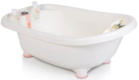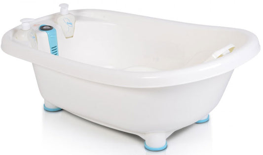 Banheiras de bebé espaçosas e anatómicas que seguem perfeitamente o crescimento do bebé, ideais para os bebés que gostam de brincar com a água. Com cómodos espaços para se colocar os objetos necessários para o banho do bebé.