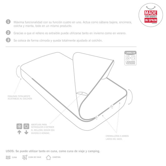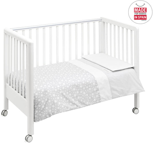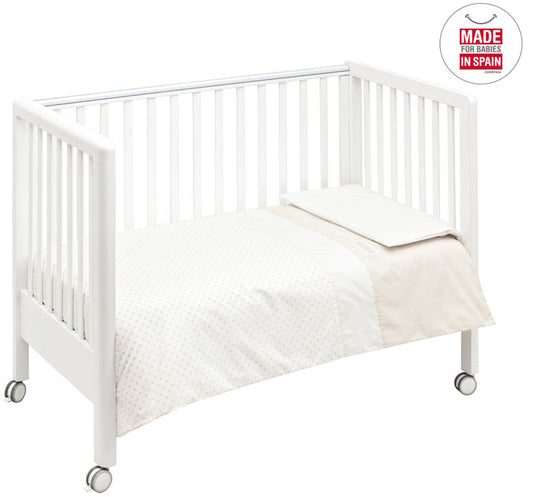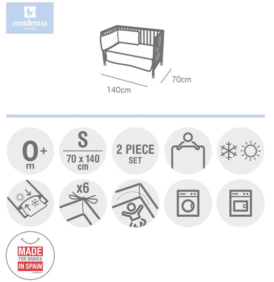 Conjunto de berço para bebés, disponíveis em várias cores com design atrativo, formado pelo edredão e o resguardo da cama de grades, com capas removíveis, para uma maior comodidade na lavagem.