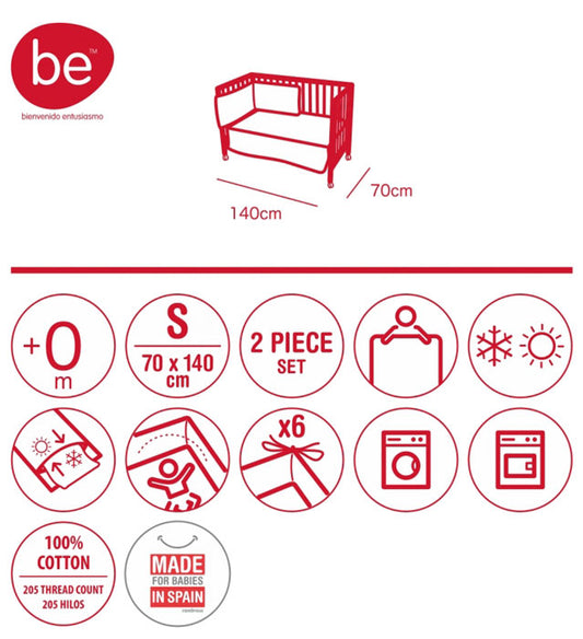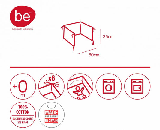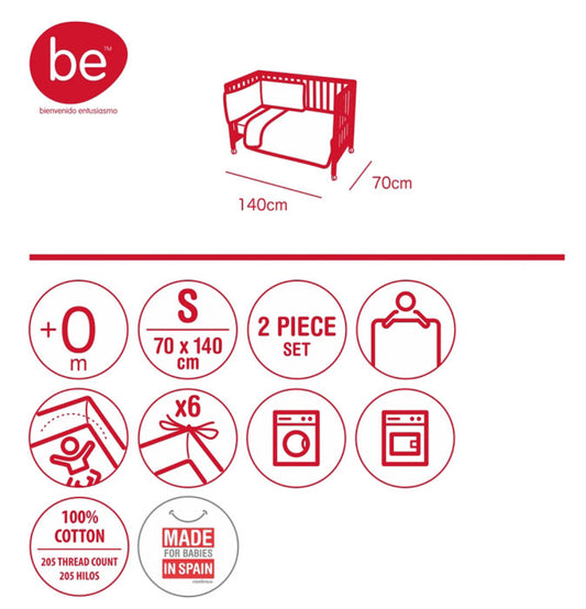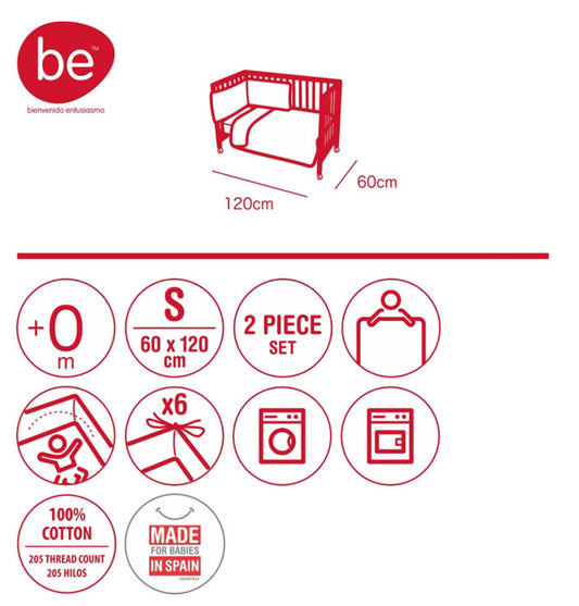 Conjunto de berço para bebés, disponíveis em várias cores com design atrativo, formado pelo edredão e o resguardo da cama de grades, com capas removíveis, para uma maior comodidade na lavagem.
