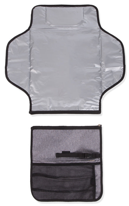 Mude o seu bebé onde e quando quiser com os práticos muda fraldas que incluem bolsos laterais para toalhitas e fraldas, bolsos traseiros e alça para transporte.