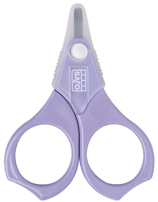 Tesouras para bebés com tampas e pontas arredondadas para uma maior segurança do bebé e comodidade dos pais.