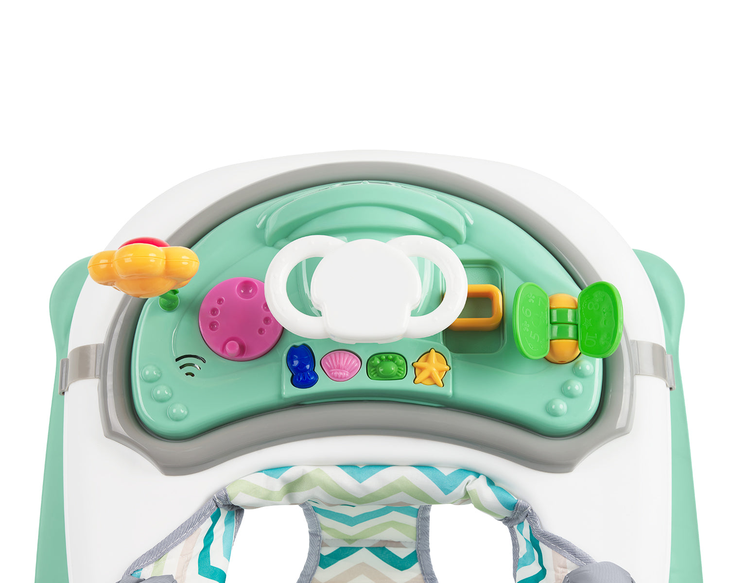 Adequado a partir dos 6 meses até aos 12 kg; Regulação da altura em 3 posições; Painel musical interativo amovível com 12 melodias; Assento macio com encosto alto; 2 rodas giratórias de 360 graus; 2 rodas fixas; Mecanismo de segurança - 6 batentes de borracha sob a base; Dobrável; Design divertido; Material plástico de elevada qualidade; Necessita de 2 pilhas AA para o painel musical (não incluídas no conjunto). Dimensões: - Produto: 50x60x60 cm / 3,6 kg - Caixa a cores: 61x15,5x71,5 cm / 4,6 kg / 1 peça/caixa a cores