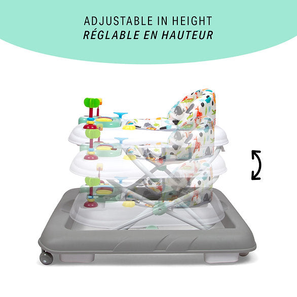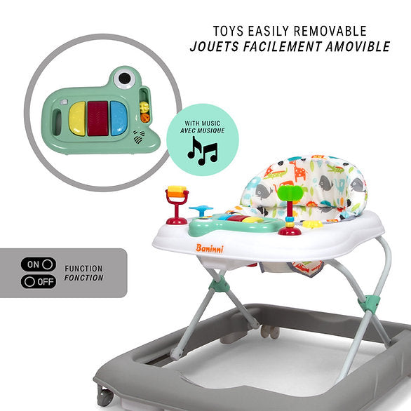 O andarilho Baninni Dino é um andarilho divertido, adequado para crianças a partir dos 6 meses, até um máximo de 12 kg. O andarilho tem uma superfície de jogo interactiva (2 pilhas AA, não incluídas) que contribui para o desenvolvimento sensorial e motor do seu filho. O andarilho pode ser ajustado em altura e dobrado após a utilização.