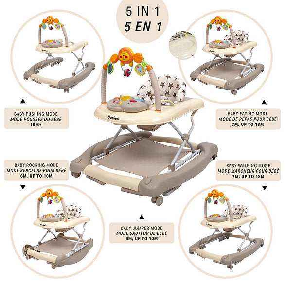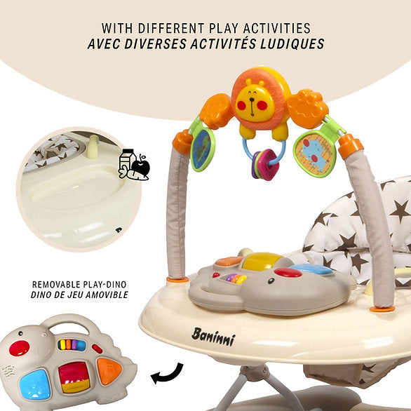 A cadeira de passeio Baninni Maya é um divertido andarilho para bebés, adequado para crianças a partir dos 6 meses, até um máximo de 12 kg. O andarilho tem uma superfície de jogo interactiva de dinossauros (2 pilhas AA, não incluídas) que contribui para o desenvolvimento sensorial e motor do seu filho. O andarilho pode ser ajustado em altura e dobrado após a utilização. O andarilho 5 em 1 tem uma posição de marcha, uma posição de balanço e uma posição de empurrar. Dimensões abertas: 65 x 72 x 67,5 cm |dimensões fechado: 65 x 72 x 46 cm