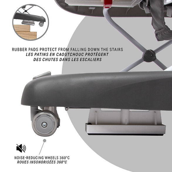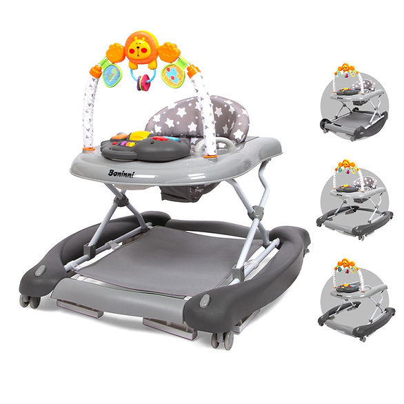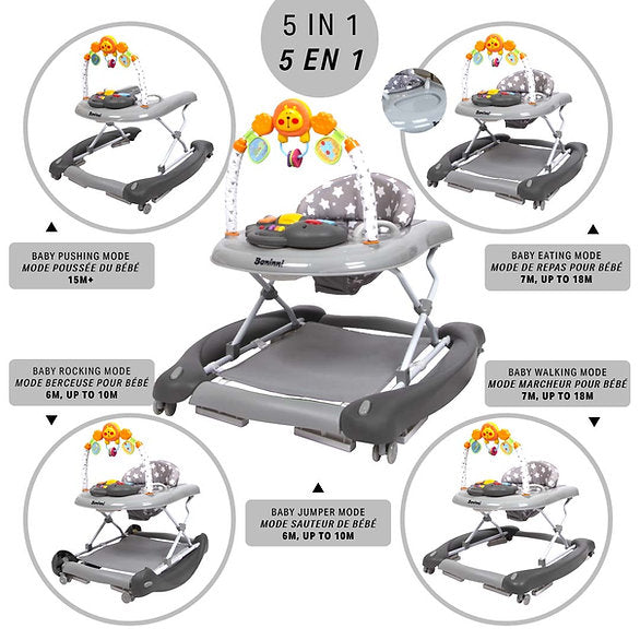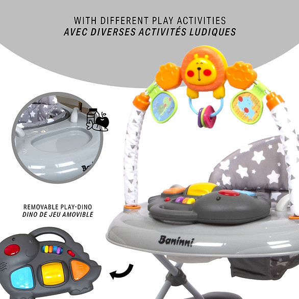 A cadeira de passeio Baninni Maya é um divertido andarilho para bebés, adequado para crianças a partir dos 6 meses, até um máximo de 12 kg. O andarilho tem uma superfície de jogo interactiva de dinossauros (2 pilhas AA, não incluídas) que contribui para o desenvolvimento sensorial e motor do seu filho. O andarilho pode ser ajustado em altura e dobrado após a utilização. O andarilho 5 em 1 tem uma posição de marcha, uma posição de balanço e uma posição de empurrar. Dimensões abertas: 65 x 72 x 67,5 cm |dimensões fechado: 65 x 72 x 46 cm