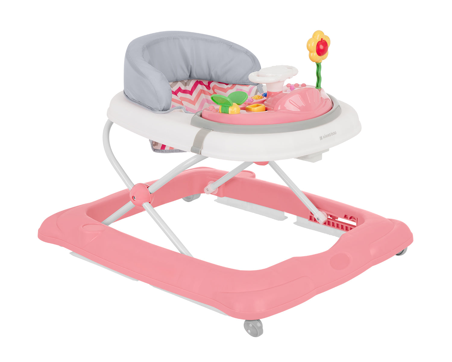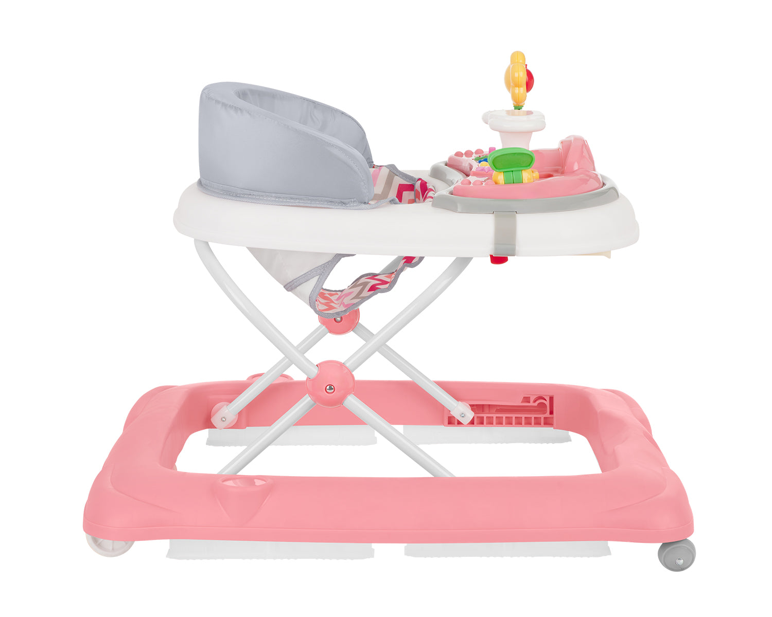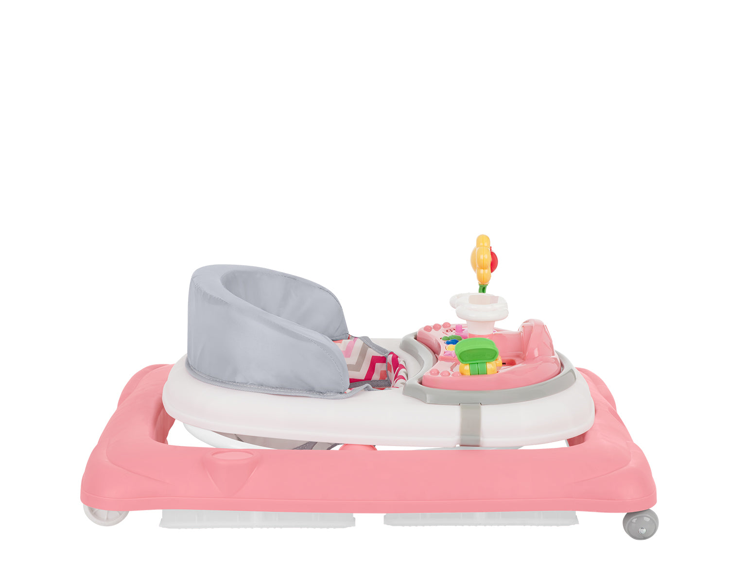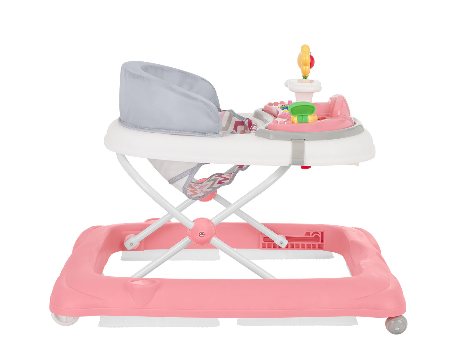 Adequado a partir dos 6 meses até aos 12 kg; Regulação da altura em 3 posições; Painel musical interativo amovível com 12 melodias; Assento macio com encosto alto; 2 rodas giratórias de 360 graus; 2 rodas fixas; Mecanismo de segurança - 6 batentes de borracha sob a base; Dobrável; Design divertido; Material plástico de elevada qualidade; Necessita de 2 pilhas AA para o painel musical (não incluídas no conjunto). Dimensões: - Produto: 50x60x60 cm / 3,6 kg - Caixa a cores: 61x15,5x71,5 cm / 4,6 kg / 1 peça/caixa a cores