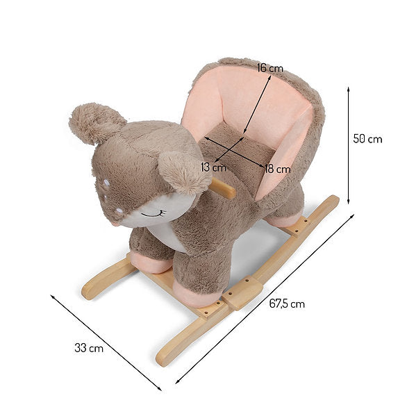 O animal de baloiço de pelúcia Baninni fará a alegria de qualquer criança! A base de madeira robusta e as pegas de madeira garantem a segurança durante o baloiço. Os estofos em pelúcia tornam o animal de baloiço agradável e macio. O animal de baloiço tem um botão de música que toca a canção Rock-A-Bye Baby. O animal de baloiço Baninni é adequado para crianças a partir de 1 ano de idade com um peso máximo de 30 kg.