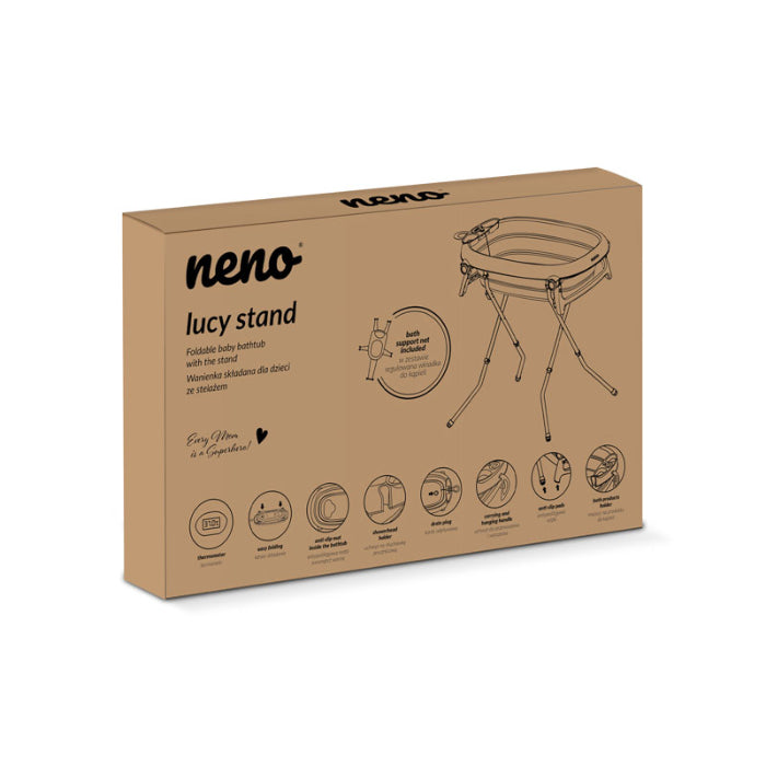Neno Lucy Stand - uma banheira confortável e segura com uma estrutura que alivia a tensão nas costas dos pais. Proporciona um apoio indispensável nos cuidados diários com o bebé. Tem um encaixe para recém-nascidos, um tapete antiderrapante e espaço para artigos de higiene pessoal. É compacta e fácil de guardar e transportar. Graças à sua construção estável e aos acessórios práticos, o banho do bebé é confortável tanto para o bebé como para a pessoa que o cuida.