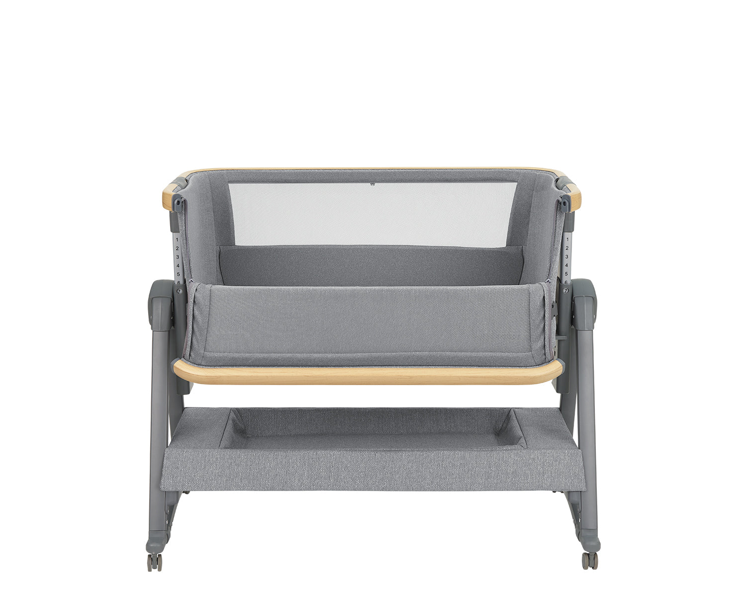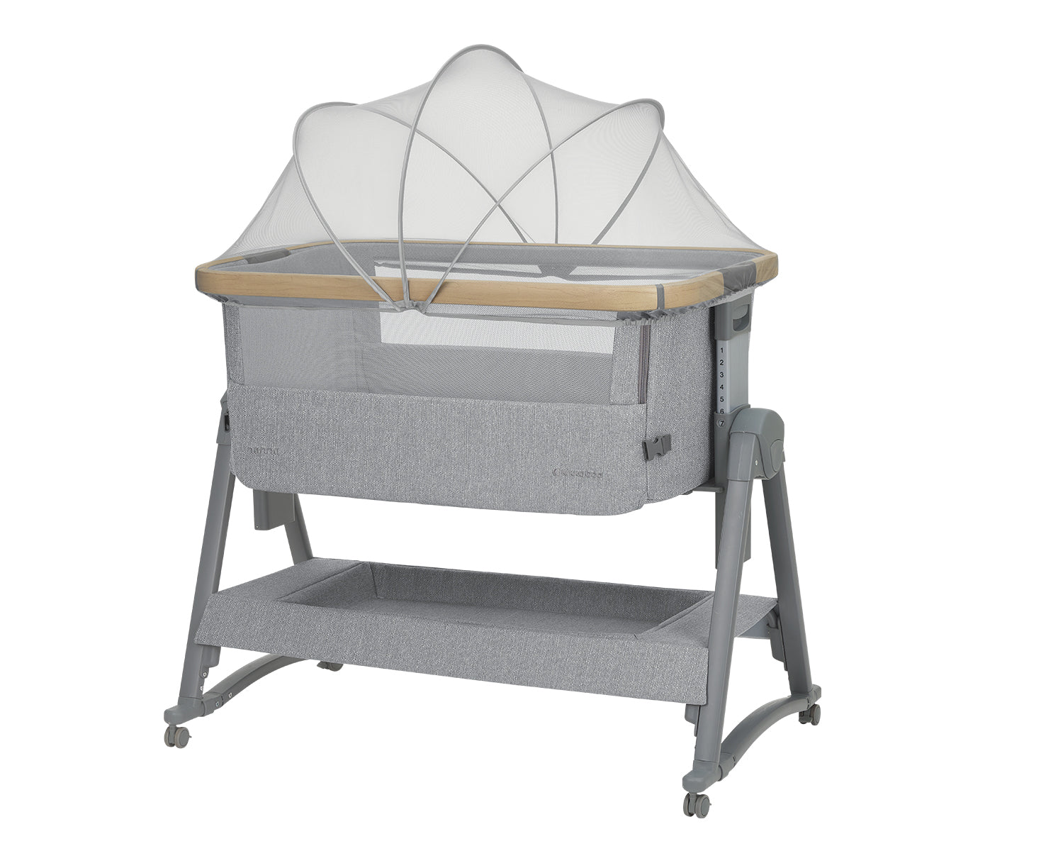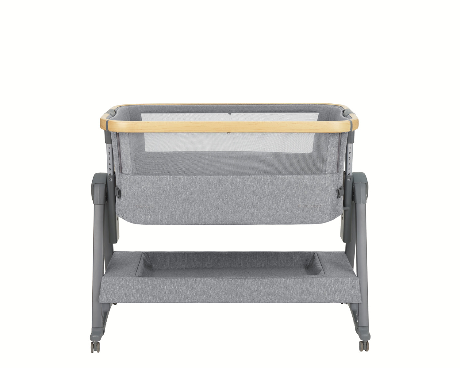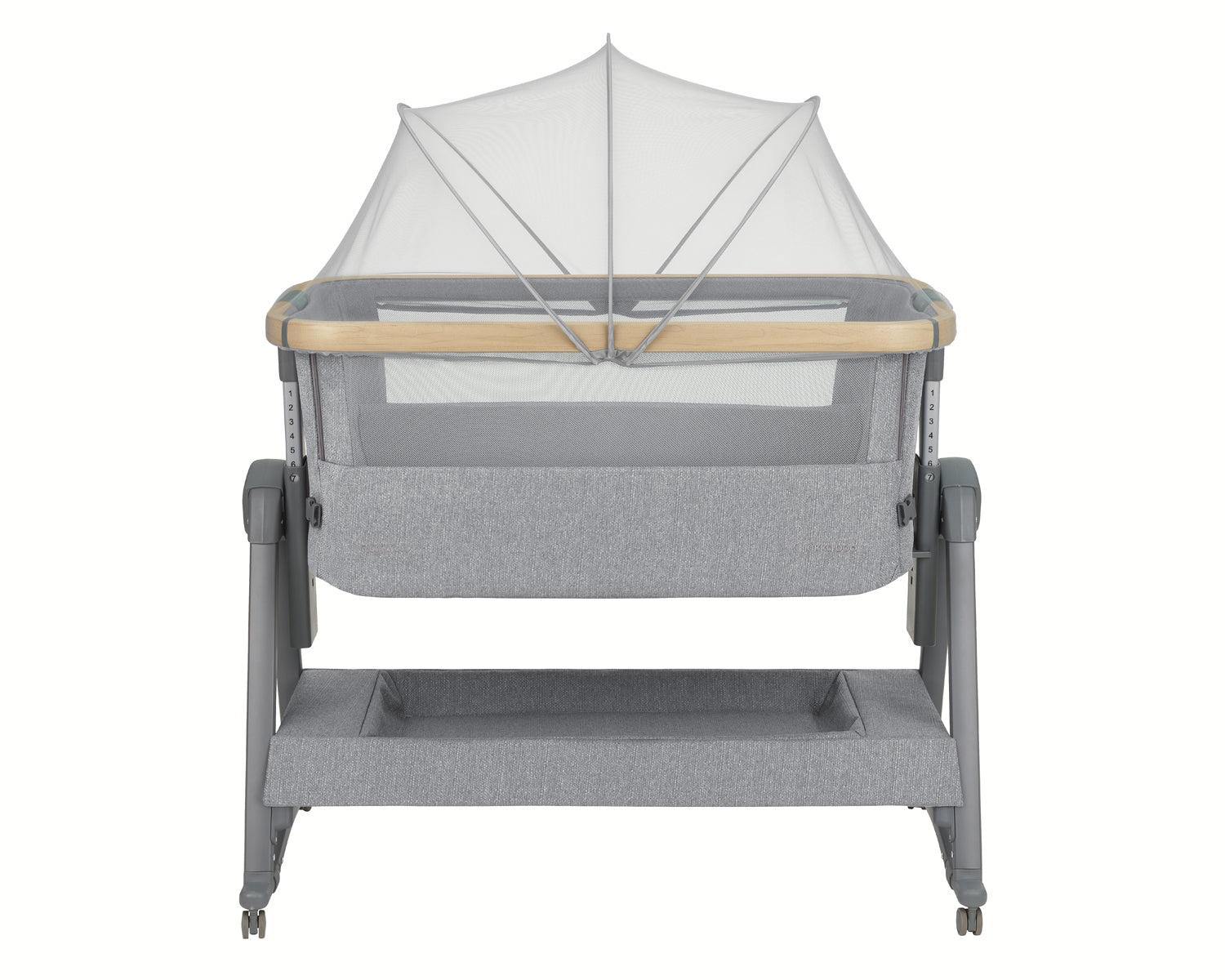 Adequado desde o nascimento até aos 6 meses, pesa até 9 kg; Berço de cabeceira que permite aos pais dormir perto do seu filho; Barras de baloiço com fecho para ajudar a acalmar o bebé e facilitar o sono; Estrutura leve em alumínio com revestimento em madeira; Regulação da altura em 7 posições; Posicionamento anti-refluxo; Rebatimento frontal; Janelas de tela em ambos os lados para melhor ventilação; Pega adicional para fixar o berço à cama dos pais; Colchão macio; 4 rodas com travões; Cesta de armazenamento; Mosquiteiro; Bolsa de transporte incluída. Dimensões: - Produto: 48x100x69-81 cm / 12,5 kg - Caixa: 96x59x18 cm / 14,2 kg / 1 unidade/caixa