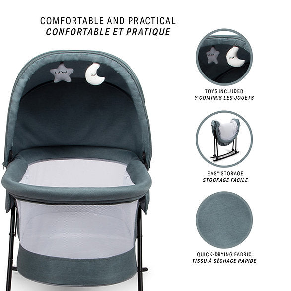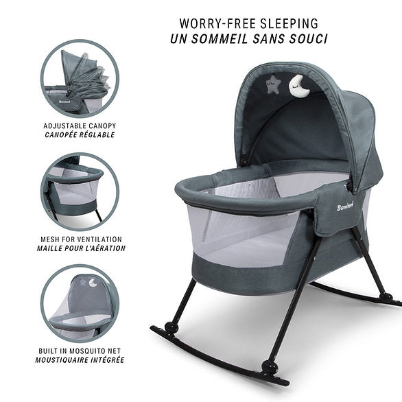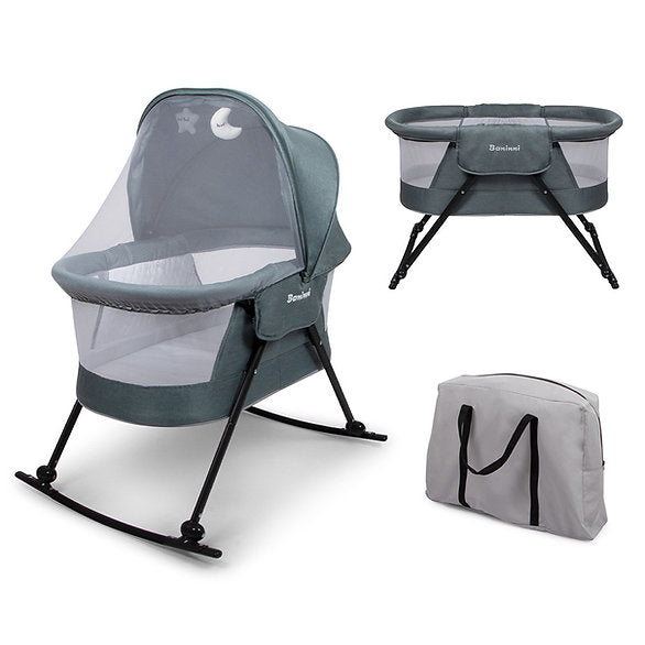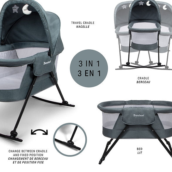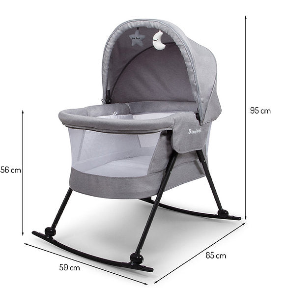 O berço Adora da Baninni é um berço de baloiço 3 em 1 com várias opções. O Adora tem uma posição de berço e uma posição de baloiço, que pode facilmente mudar de posição dobrando as pernas para dentro ou para fora. O berço tem um capuz amovível com tecido de rede e brinquedos. A estrutura é leve e estável. O berço está equipado com uma rede para uma boa circulação do ar. Com o saco de transporte, pode facilmente levar o berço para qualquer lado e utilizá-lo como berço de viagem. O berço de baloiço Baninni é adequado desde o nascimento até aos 6 meses (máx. 9 kg).