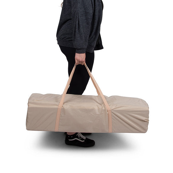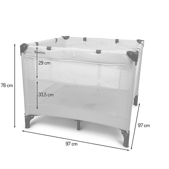 A cama de viagem Neva é uma cama de bebé leve, feita de alumínio e poliéster, com um colchão de inserção com base elevada e rede. A cama de grades é adequada para crianças desde o nascimento até um máximo de 15 kg. A cama de viagem é fornecida com um prático saco de transporte e é fácil de montar.
