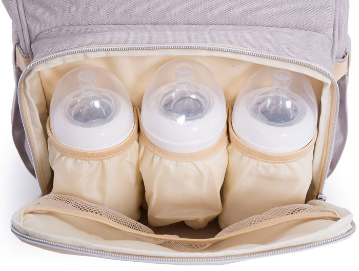 Tecido melange luxuoso; Inclui tapete muda fraldas; Clipes para fixação fácil ao guiador do carrinho; Bolso principal com abertura larga para fácil acesso; Bolsos organizadores para fraldas e roupa; Bolso resistente à água para artigos húmidos; 3 compartimentos para biberões que mantêm a água e o leite quentes durante horas; Abertura com fecho de correr na parte de trás para aceder ao fundo do bolso principal; Alça elástica comprida para prender ao carrinho; Adequada como mala de mão e mochila. Medidas: 21x27x42 cm. Informação do Fabricante: KIKA GROUP LTD