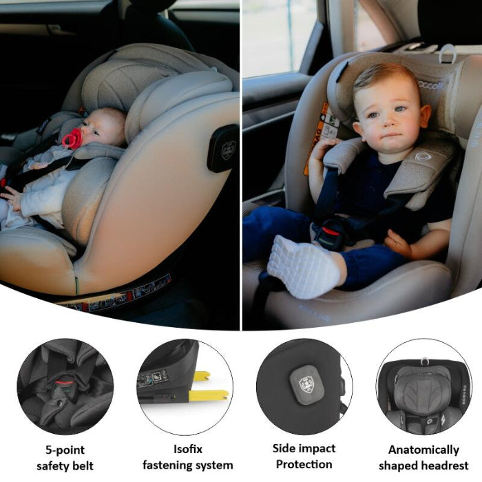 A segurança dos bebés está sempre em primeiro lugar quando se fala em viajar de carro, mas é bom que as cadeiras auto tragam também uma tranquilidade extra ao pequeno e aos pais. A Coccolle Nova iSize dá as boas-vindas aos pequenos utilizadores e aos seus pais, trazendo uma série de actualizações que a tornam não só de acordo com as mais recentes normas de segurança automóvel, mas também compatível com vários automóveis, oferecendo o mesmo elevado nível de conforto. A cadeira auto Nova iSize pode ser utilizada virada para o sentido da marcha até 105 cm. Recomendamos sempre a utilização mais alargada deste método de instalação, mas para as crianças que sentem a necessidade de estar viradas para o sentido da marcha, a cadeira oferece a vantagem de a utilizar a partir de 76 cm. A inserção para recém-nascidos foi concebida para ser o mais ergonómica possível e é acolchoada com espuma de memória. Os choques são absorvidos não só por estes elementos de espuma com memória, mas também pelo dispositivo de proteção lateral. Uma melhoria colossal deste produto é o cinto de segurança superior com libertação rápida, que o ajudará a soltar o cinto de segurança superior sem o desprender do automóvel. Desta forma, pode sempre utilizar a função de rotação! De acordo com a norma R129, a instalação no automóvel é efectuada com a ajuda do isofix, pelo que a compatibilidade com os veículos é mais ampla. Quanto ao conforto, para além do acolchoamento premium, a cadeira auto Nova iSize oferece uma reclinação generosa tanto para a frente como para trás no sentido da marcha, um apoio de cabeça ajustável em 15 posições de altura e um assento de dimensões generosas. Os cintos de segurança serão retirados a partir dos 100 cm de altura, e a cadeira tornar-se-á perfeita para essa fase da vida do bebé. Caraterísticas principais: -cadeira auto certificada iSize, categoria 40-150 cm - rotação de 360 graus - possibilidade de ser utilizada com as costas viradas para o sentido da marcha até 105 kg - instalação no automóvel com a ajuda do isofix e do cinto top-tether; o cinto tem um desengate rápido sem necessidade de o desafivelar do automóvel - graus de inclinação adequados a todas as categorias de altura e independentemente da posição de utilização - encaixe para recém-nascidos com espuma viscoelástica - dispositivo de proteção contra impactos laterais - materiais e acolchoamento de primeira qualidade para um elevado grau de conforto. Informação do Fabricante: DHSBABY SRL