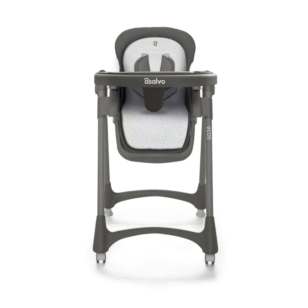 Regulável em altura em 7 níveis, adapta-se a qualquer mesa. A sua estrutura robusta em aço e o arnês de 5 pontos garantem uma segurança em conformidade com as normas europeias. Oferece conforto com um encosto regulável em 3 posições e um apoio para os pés regulável. O tabuleiro duplo regulável e amovível em 3 posições facilita a alimentação, enquanto a almofada redutora proporciona um conforto suplementar. É também compacta e fácil de limpar, com uma almofada lavável e um tabuleiro lavável na máquina de lavar louça. As duas rodas com travões tornam-na funcional e fácil de deslocar. MULTIFUNCIONAL: SOJA é a cadeira da papa ideal para bebés que se conseguem sentar sozinhos (aprox. 6 meses). Adequada até um peso máximo de 15 kg.
