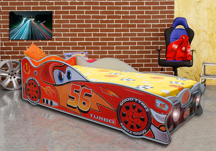 Uma cama para uma criança em forma de carro fabricada na Polónia. A cama é nova, não foi usada, completa com um colchão. O móvel é feito de uma placa para móveis de 18 mm de espessura, os bordos são fixados com um rebordo de borracha. Os autocolantes dos berços são revestidos com laminado, que protege o autocolante contra a água e os raios UV.