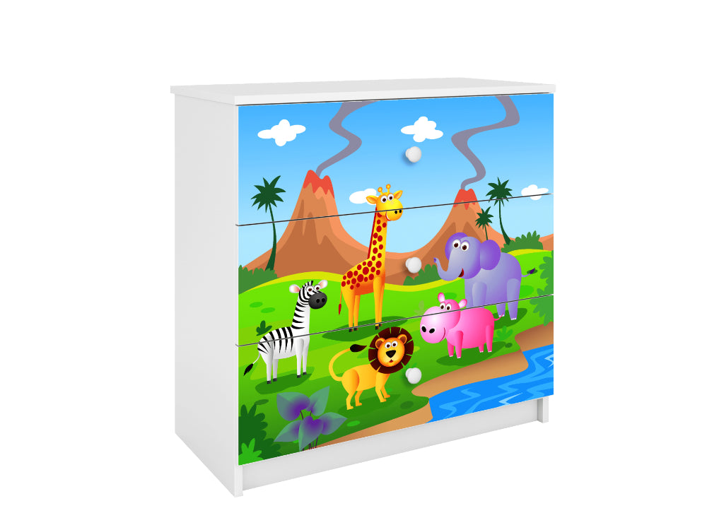 A cómoda é fabricada em painel de mobiliário laminado de alta qualidade com 18 mm de espessura. Tem 3 gavetas espaçosas com uma profundidade de 34 cm. Estão montadas em corrediças de rolos que permitem uma utilização fácil.