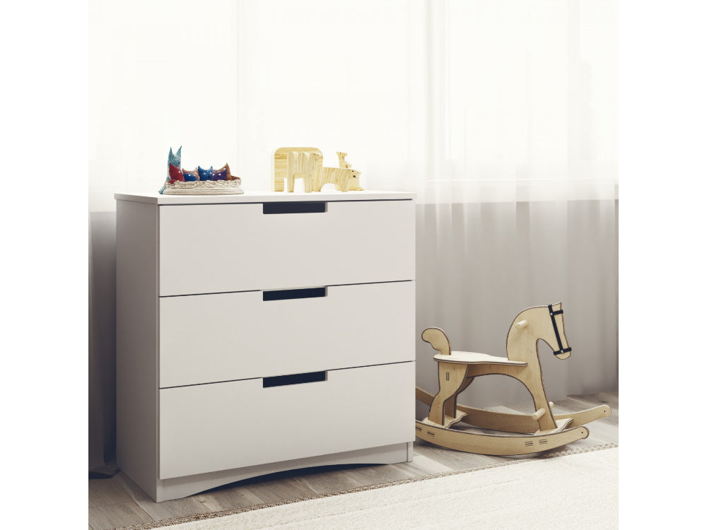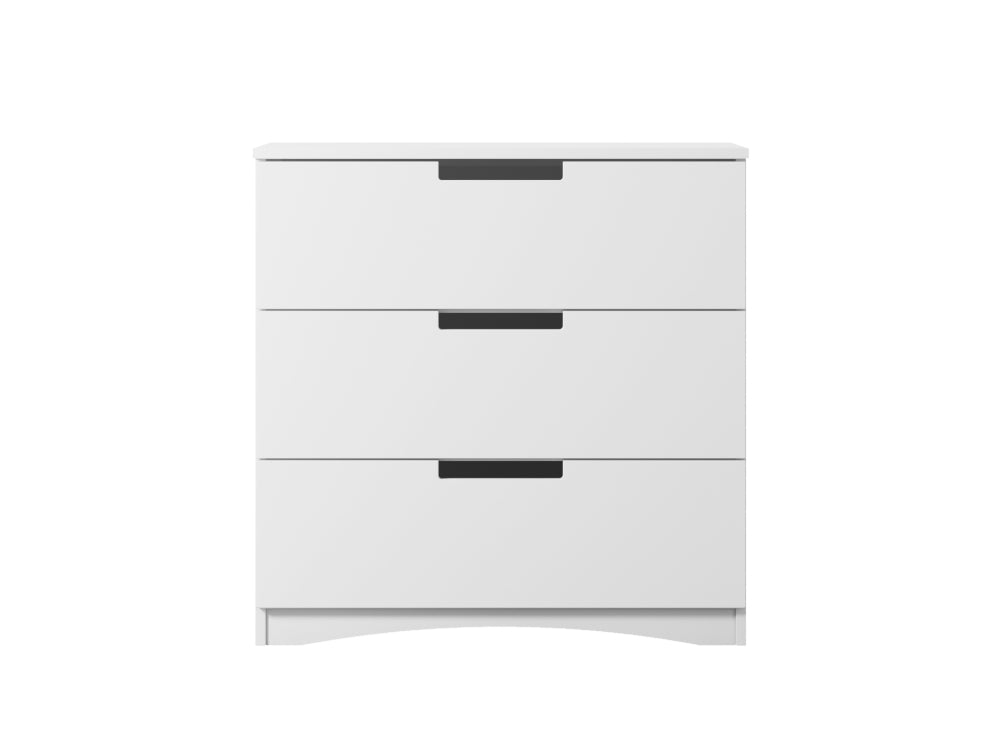 A cómoda é fabricada em painel de mobiliário laminado de alta qualidade com 18 mm de espessura. Tem 3 gavetas espaçosas com uma profundidade de 34 cm. Estão montadas em corrediças de rolos que permitem uma utilização fácil.