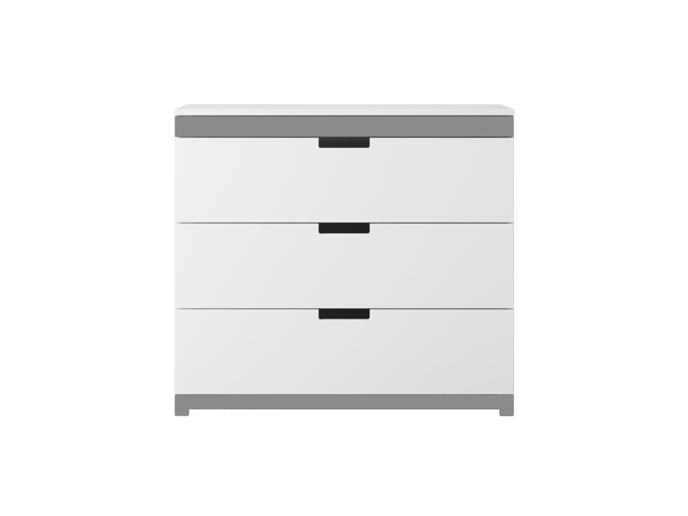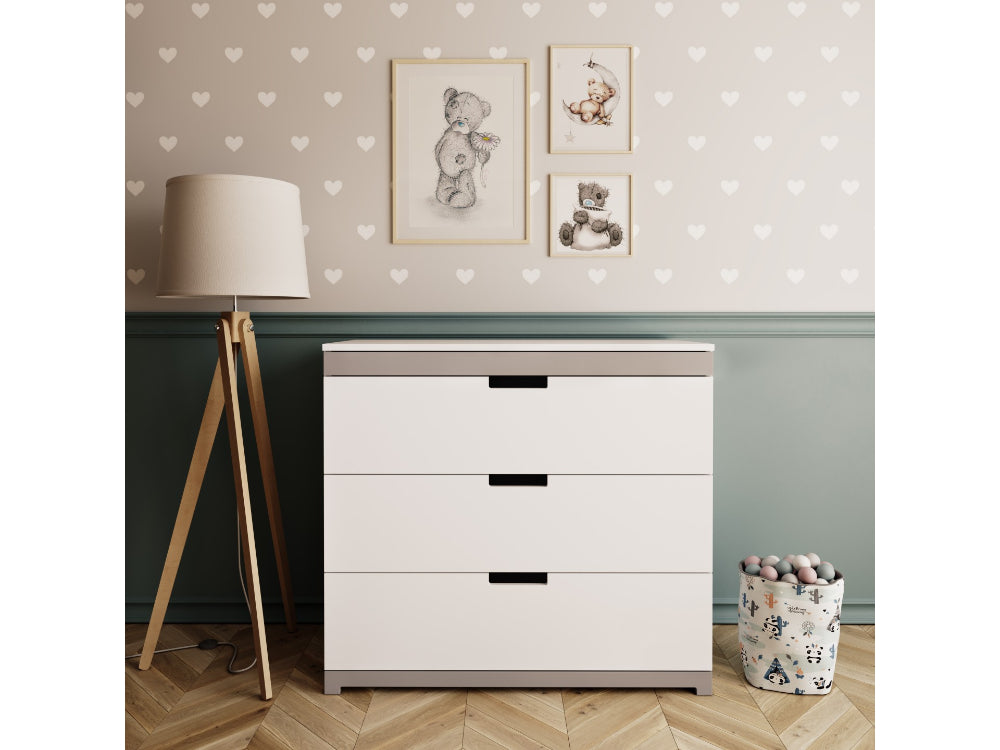A cómoda tem 3 gavetas muito espaçosas que foram lacadas três vezes com tintas ecológicas seguras para crianças.