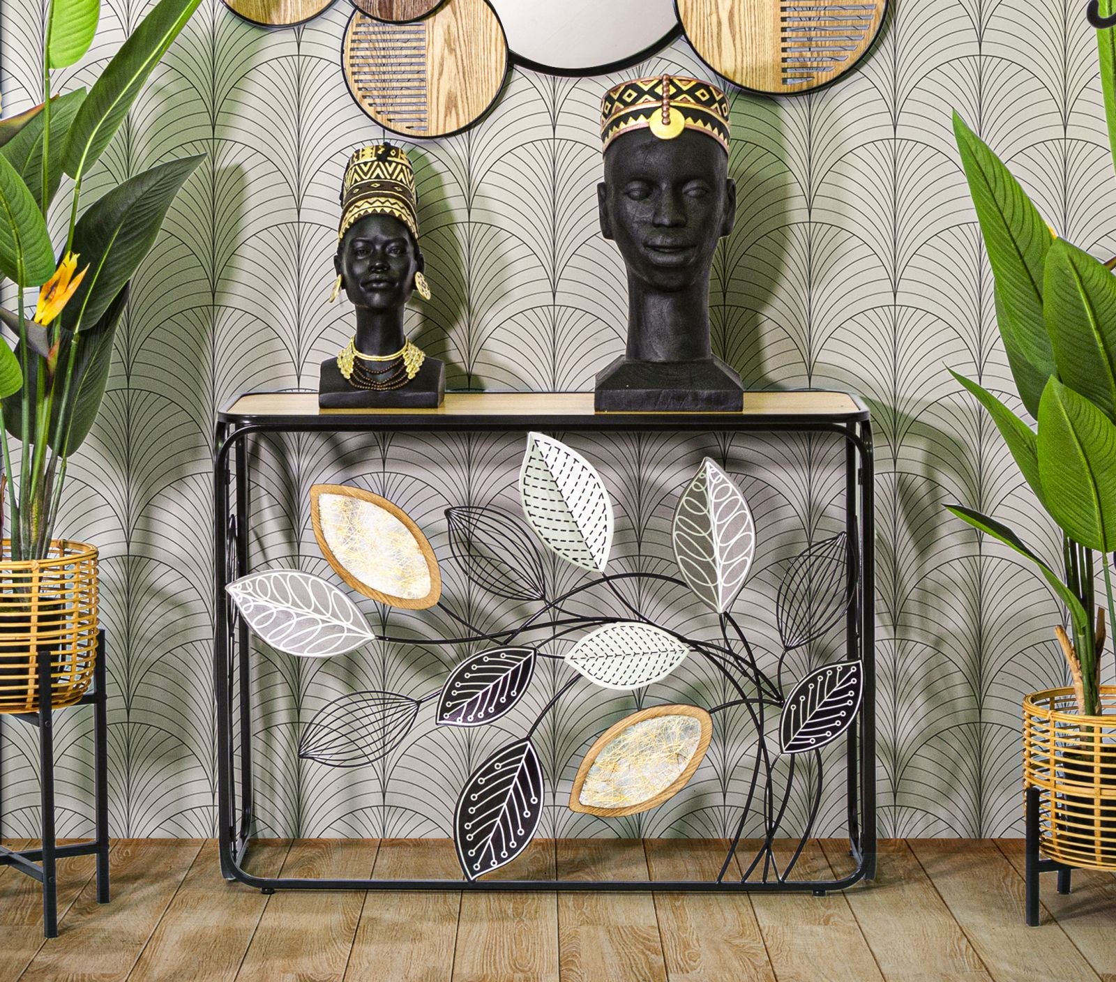 Consola em metal preto, com detalhes de folhas. Combina funcionalidade e elegância, adaptando-se com facilidade a diferentes estilos de decoração.