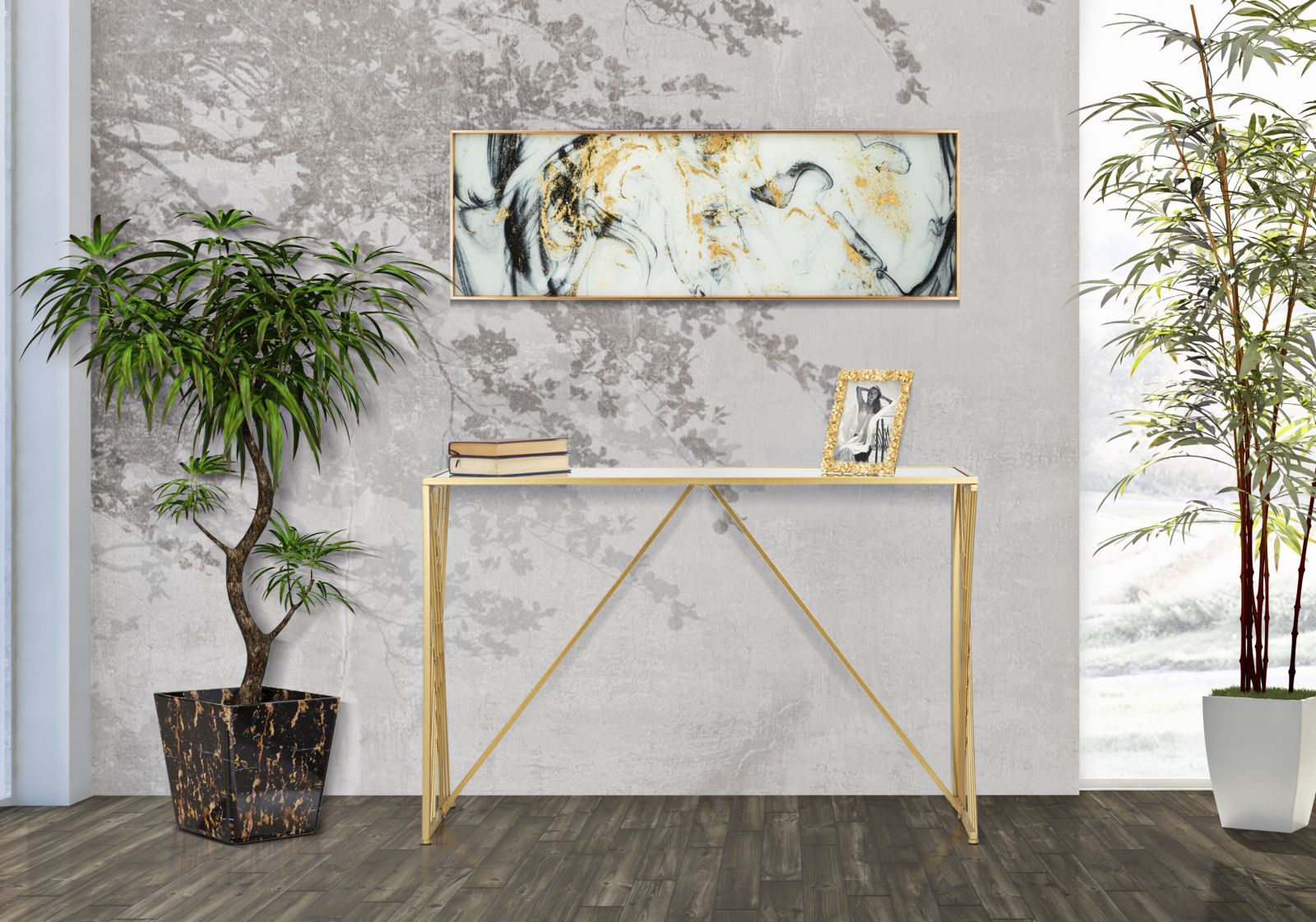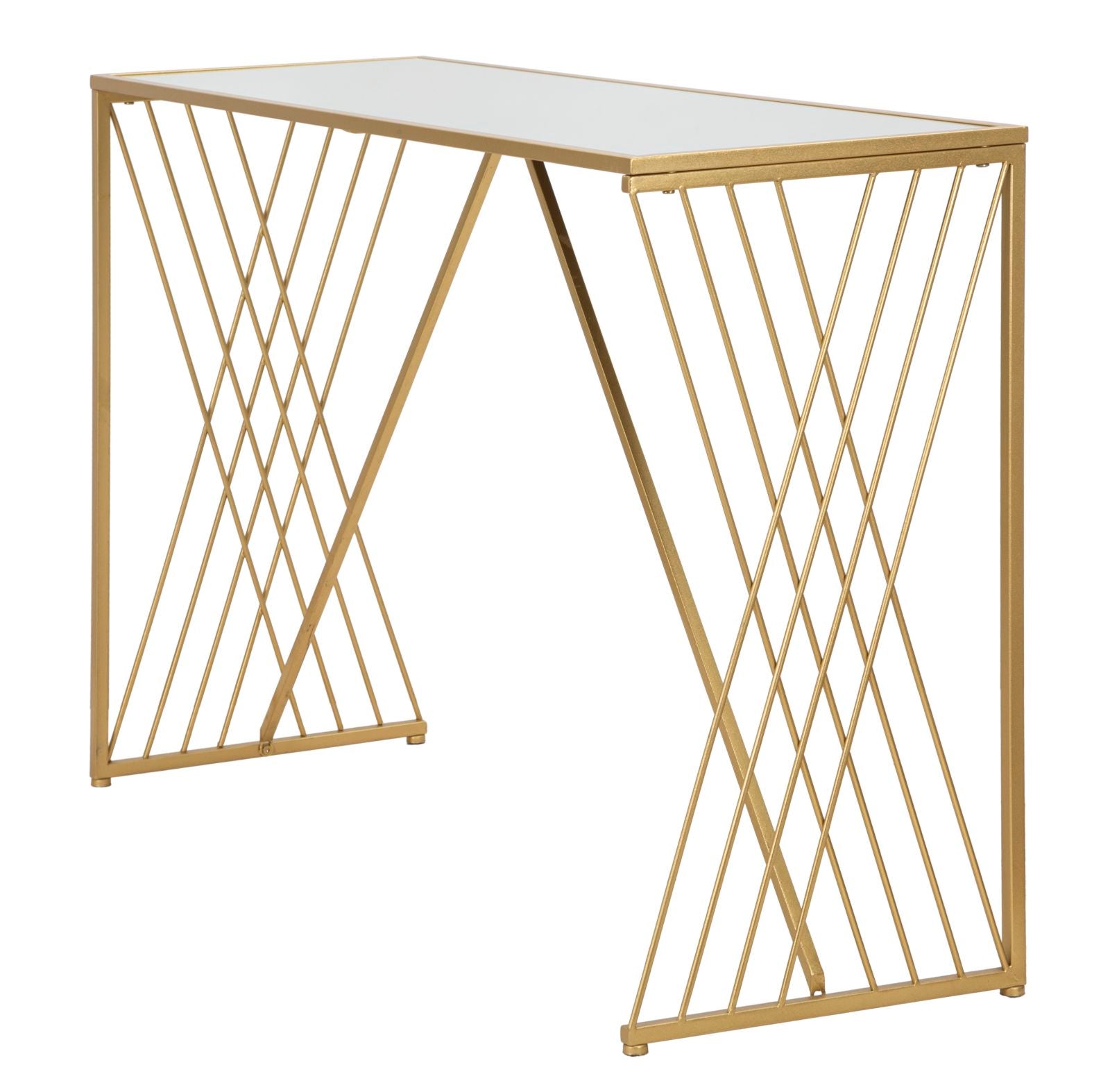 Espelho em metal dourado, com tampo em vidro. Ajuda a ampliar visualmente o espaço e a reforçar a luminosidade do ambiente.