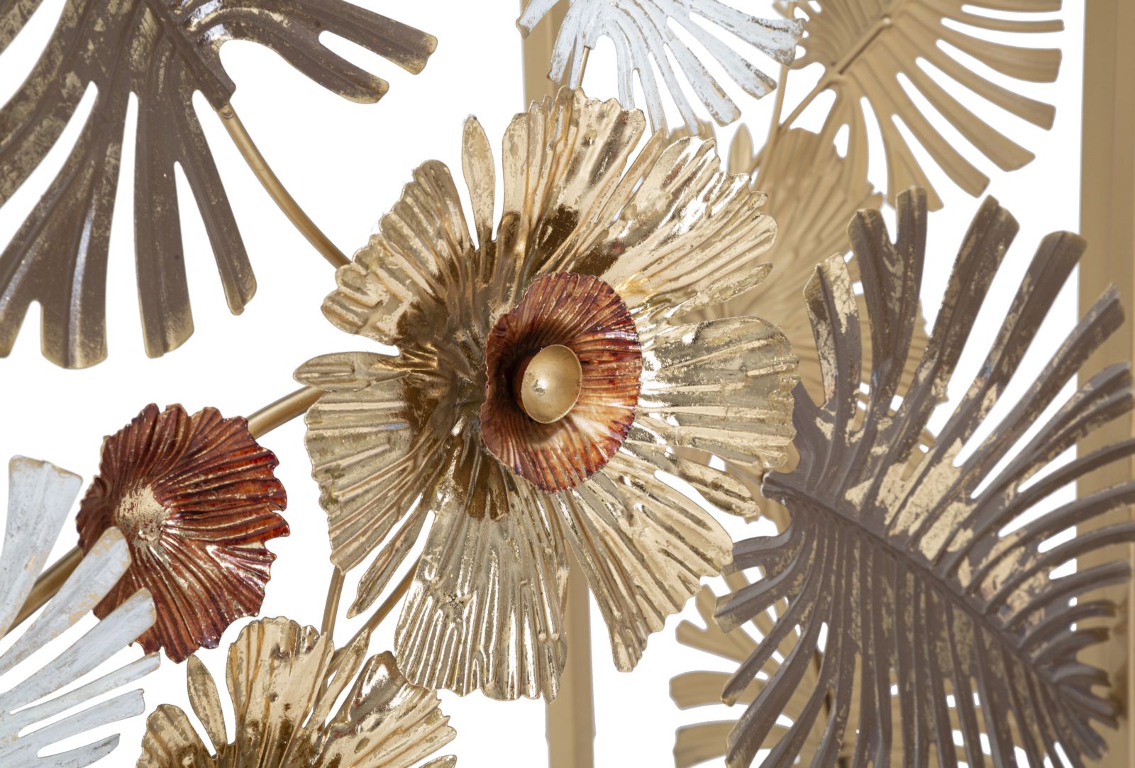 Espelho em metal dourado, com detalhes de folhas e flores, com tampo em vidro. Ajuda a ampliar visualmente o espaço e a reforçar a luminosidade do ambiente.