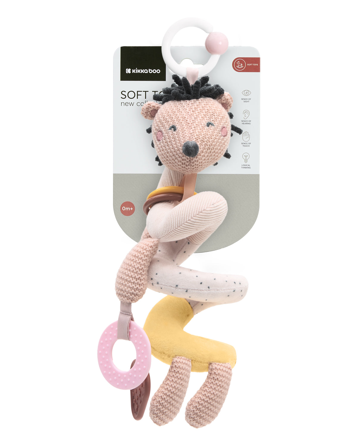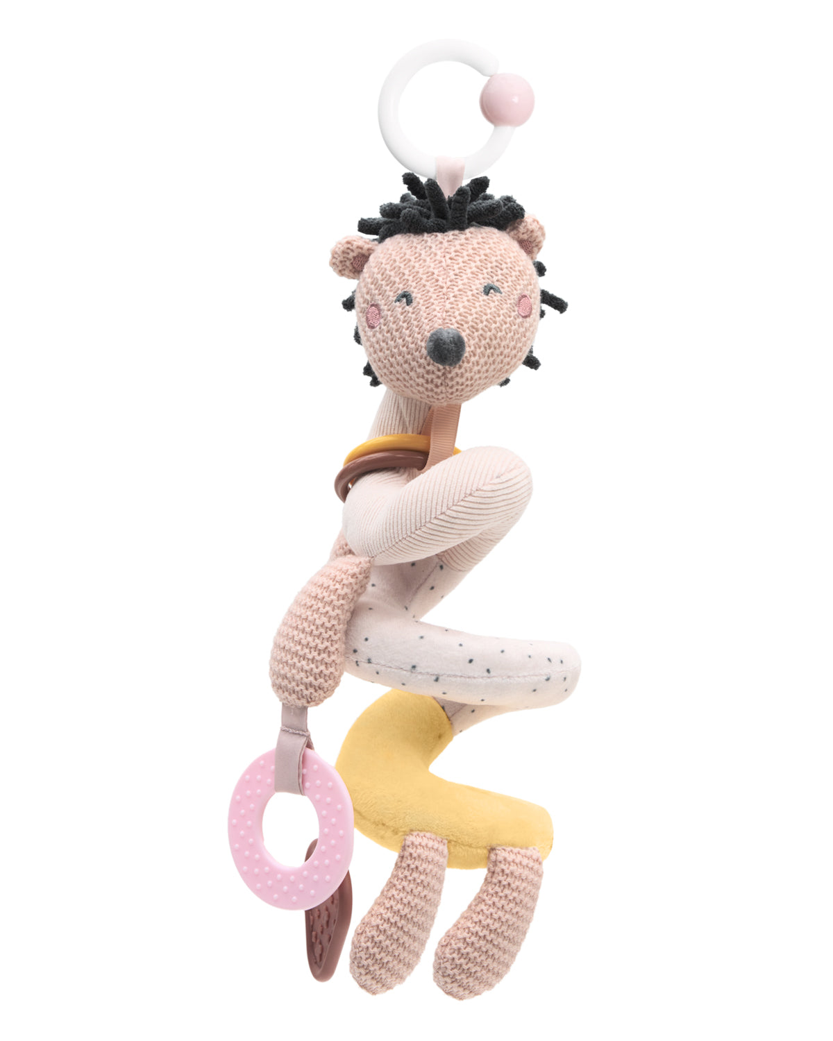 Brinquedo de peluche macio com formato espiral vertical; 2 mordedores coloridos, chocalho e detalhes em papel amachucado; Anel de plástico na parte superior para fácil fixação; Perfeito para a grade do berço do bebé ou para a barra protetora do carrinho; Fabricado em materiais seguros e de alta qualidade; Aprovado pela EN 71; Adequado para crianças dos 0 aos 3 anos; Tamanho: 28,5 cm. Dimensões: - Produto: 28,5 cm / 0,12 kg - Caixa: 48x30x34 cm / 3,7 kg / 24 unidades/caixa