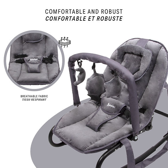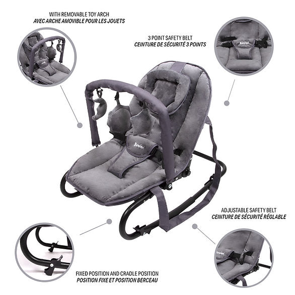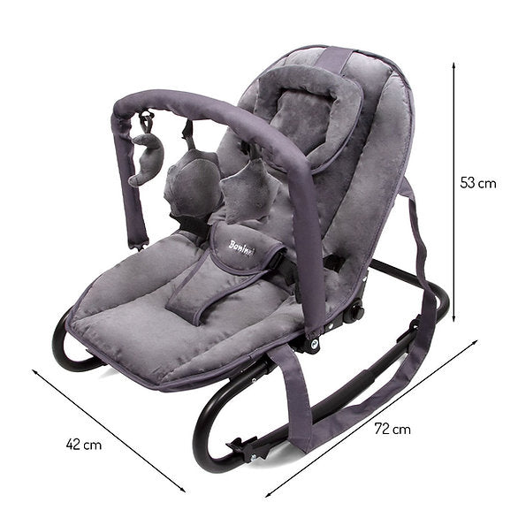 A espreguiçadeira Malena da Baninni permite ao seu bebé relaxar ou brincar com conforto. A espreguiçadeira com posição de balanço tem um encosto ajustável para que o seu filho possa desfrutar de uma posição reclinada ou sentada na vertical. Pode ajustar o encosto em 4 posições. Para maior conforto, a espreguiçadeira tem uma almofada de cabeça amovível. A espreguiçadeira possui também um arco amovível para brincar com peluches e um arnês de 3 pontos para maior segurança. A capa preta também é amovível e pode ser lavada a 30°C. A pega de transporte facilita a deslocação e a arrumação da cadeira de bebé. A espreguiçadeira Baninni é adequada para crianças dos 0 aos 6 meses (máx. 9 kg).