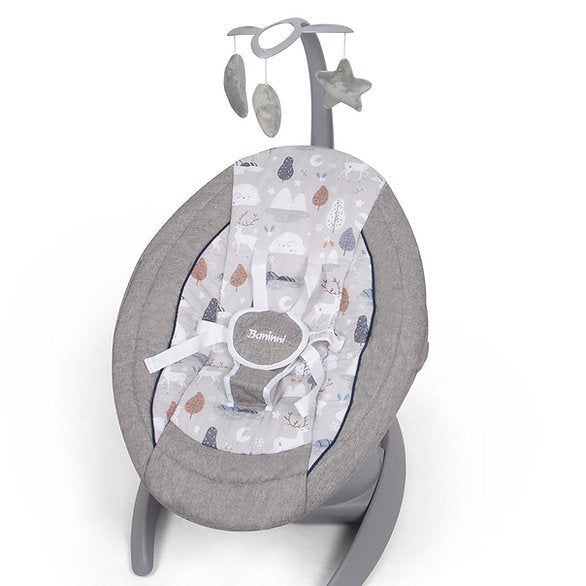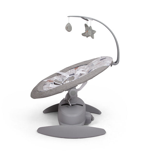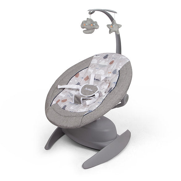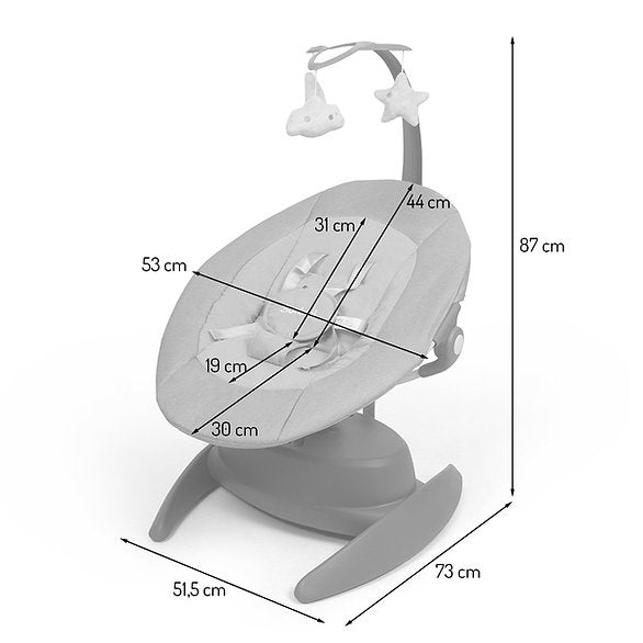 O baloiço Roya com música foi especialmente concebido para ajudar as crianças a relaxar completamente. Escolha entre 5 velocidades de balanço, 6 modos de balanço, uma música personalizada ou deixe simplesmente a cadeira reclinável na sua posição fixa. Além disso, o assento roda 360° e é regulável em 3 posições. O arco de jogo é ajustável e amovível. O baloiço pode ser utilizado com um adaptador ou com pilhas (não incluídas) e pode ser acionado com os botões e a alavanca na estrutura. O confortável baloiço para bebé é adequado desde o nascimento até ao peso máximo de 9 kg.