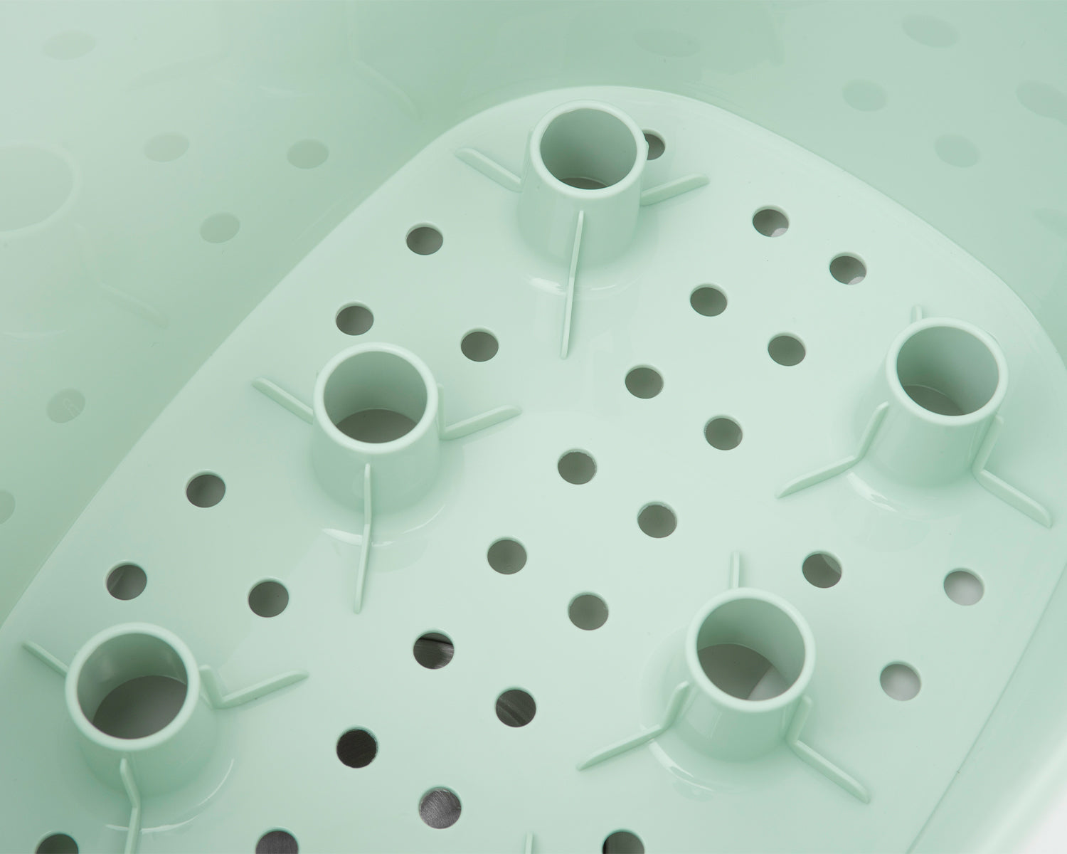 Fabricado com materiais de alta qualidade e cuidadosamente desenhado para as necessidades das mães; Três modos: Esterilização e Secagem, Esterilização e Semi-secagem e Esterilização; Compacto, portátil e prático; Tampa transparente com janela, permitindo a monitorização do processo; Grande capacidade para 6 tamanhos diferentes de biberões e outros utensílios de mesa para bebés; Fabricado em PP, aço inoxidável e ABS. Dimensões: - Produto: 19x24x33 cm / 1,28 kg - Caixa a cores: 20x25,5x28,5 cm / 1,4 kg - Caixa: 52,5x59x62,5 cm / 22,8 kg / 12 unidades/caixa