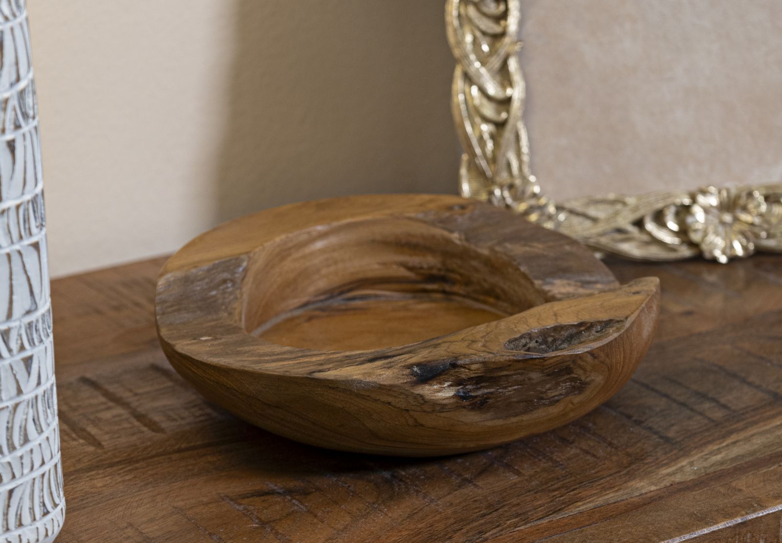 Peça decorativa em teca reciclada. A teca reciclada acrescenta autenticidade, calor e um carácter natural à peça. Perfeito para valorizar o ambiente com um toque distintivo e sofisticado.