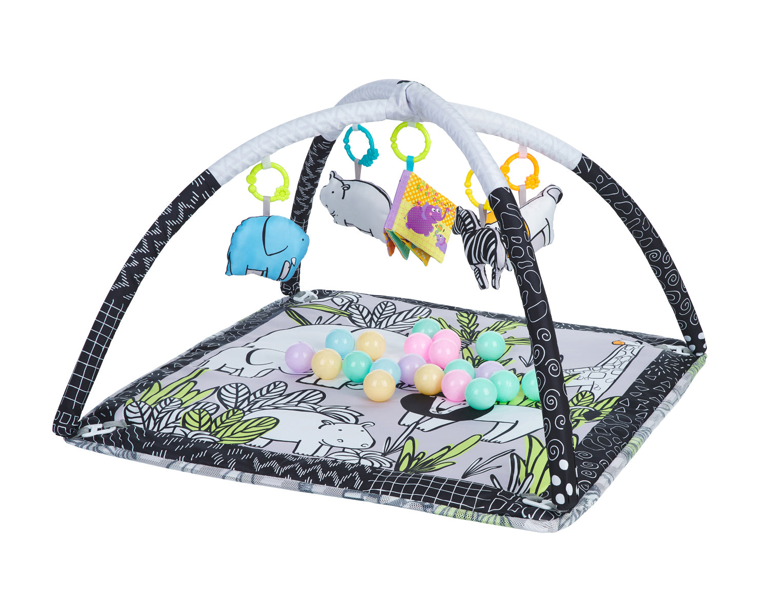 Adequado para crianças dos 0 aos 36 meses; Três formas de usar: de barriga para baixo, de barriga para baixo e sentado; Brinquedos interativos; 18 bolas coloridas e arcos de brinquedo destacáveis; Desenvolvimento de competências motoras: alongamentos e pontapés; Ambiente de jogo multissensorial; Possui função para fechar os 4 lados. Dimensões: - Produto: 78x75x50 cm / 0,61 kg - Caixa a cores: 56x8x50,5 cm / 1,018 kg / 1 peça / caixa a cores - Caixa: 52x52x58 cm / 8,5 kg / 6 peças / caixa