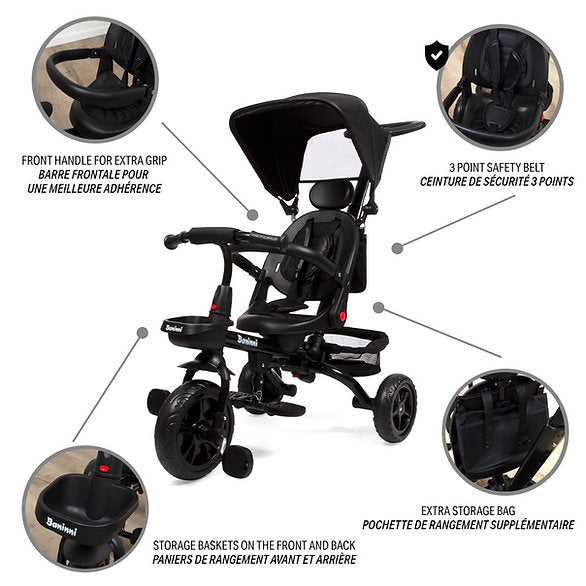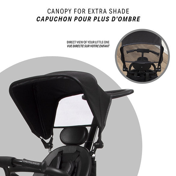 O triciclo Reina é um triciclo divertido para crianças de 1 a 5 anos (máx. 25 kg). O triciclo está equipado com um assento rotativo de 360°, um apoio frontal, um para-sol regulável, uma barra de empurrar regulável, um apoio para os pés, pedais, um arnês de 3 pontos e um cesto à frente e atrás.
